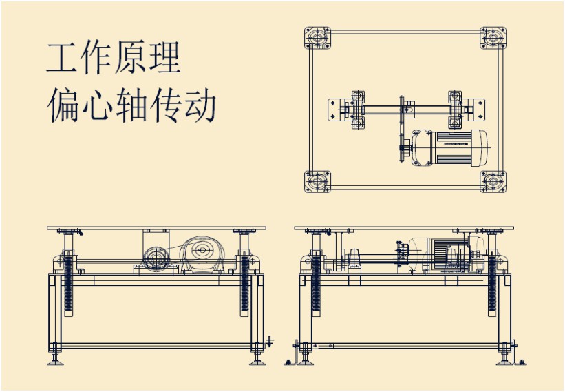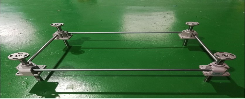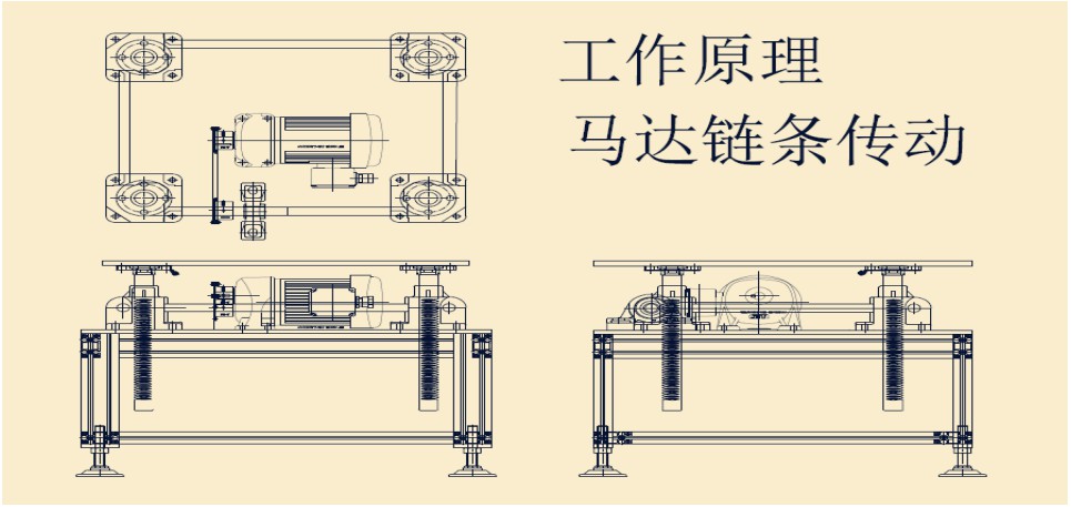 1.工作原理;依靠齿轮和齿条之间的联动配合,保证四个或多个支撑点同步升降,进而实现工作平台平稳升降,四个支撑点的同步误差最小可达0.5mm